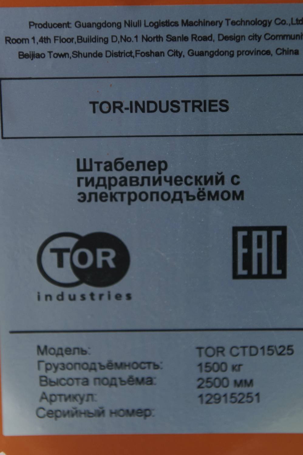 -----Штабелер гидравлический с электроподъемом TOR 15/25, 1,5 т 2,5 м (CTD)