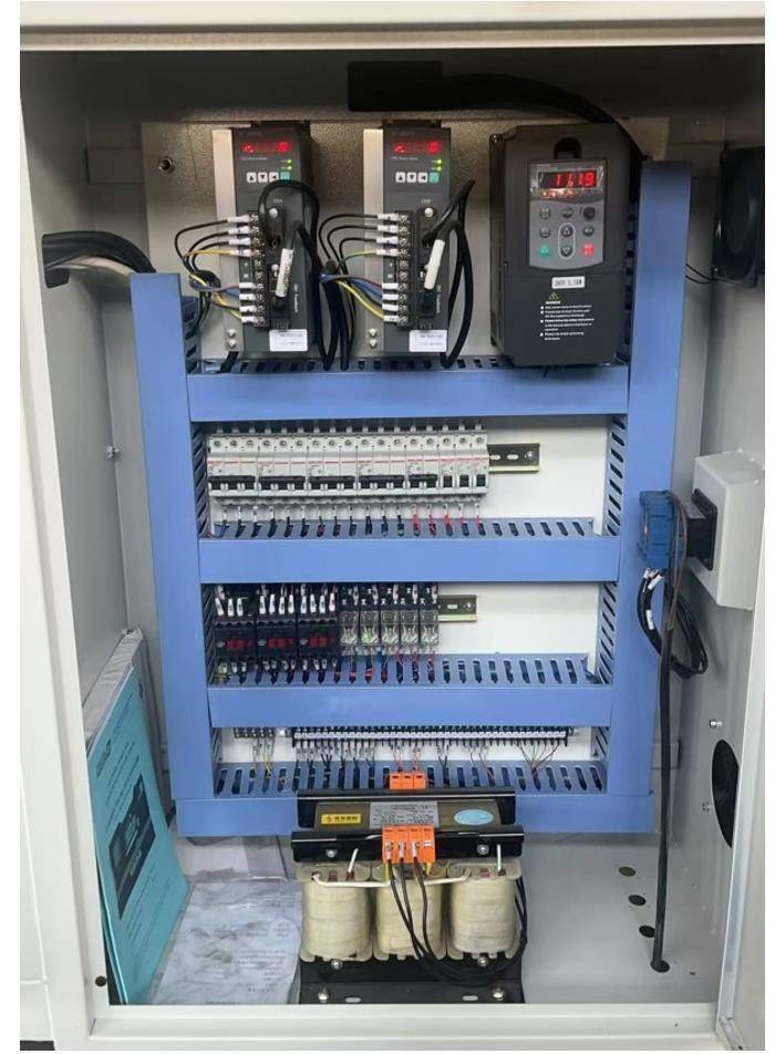 С тыльной стороны станка расположен электрошкаф. Сервоприводы бренда GSK и качественные электрокомпоненты, а также частотный преобразователь обеспечивают надежную и бесперебойную работу оборудования. Дверца электрошкафа оснащена концевым выключателем.